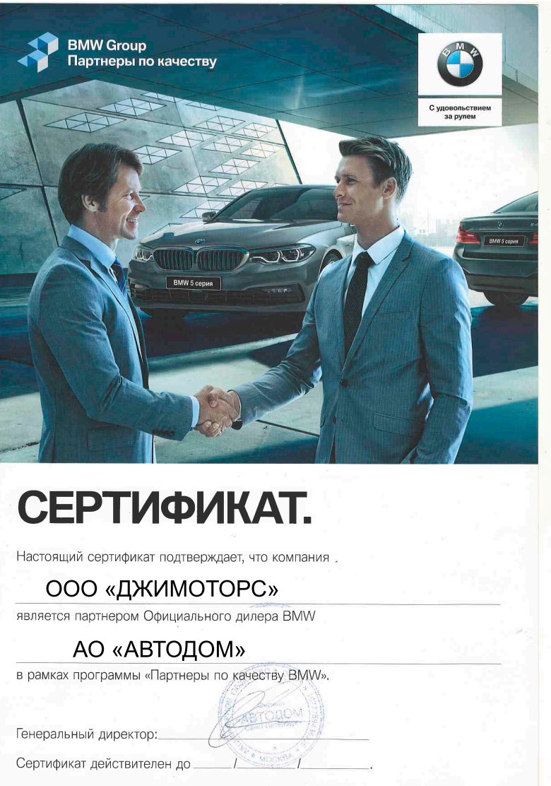 Официальный сертификат от BMW Group, подтверждающий партнерский статус компании ООО «ДЖИМОТОРС» в рамках программы «Партнеры по качеству BMW».